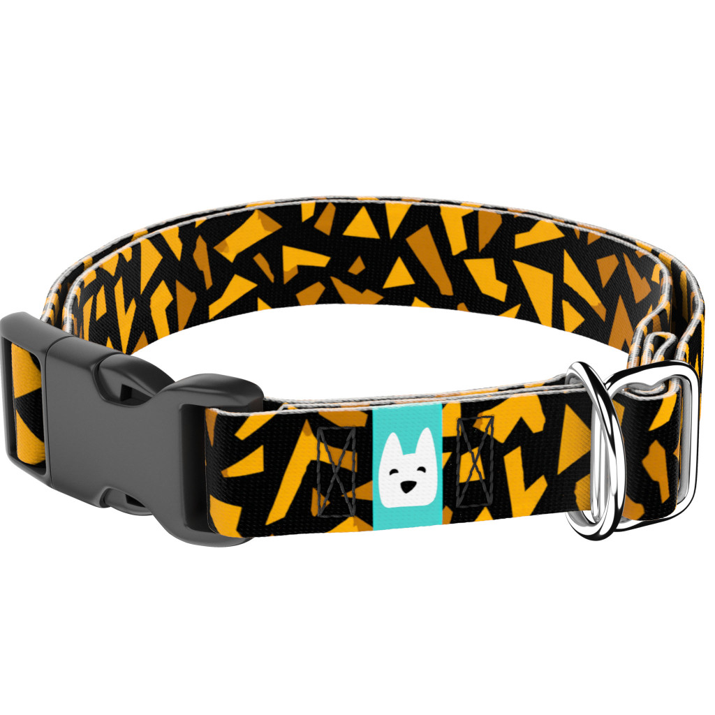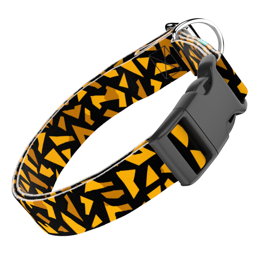 Sárga és fekete mintás csatos nyakörv kutyádnak különböző méretekben.