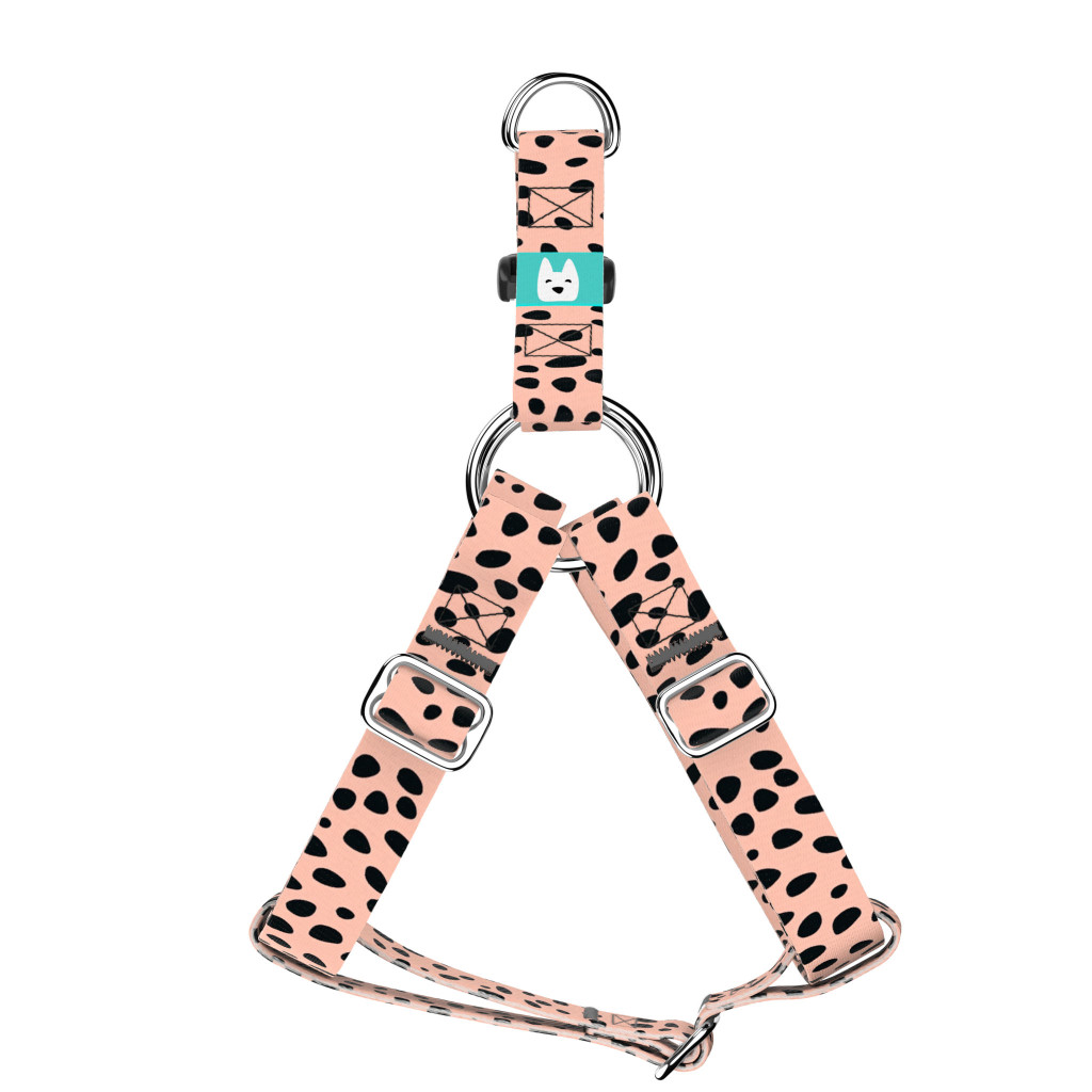 Fekete foltok rózsaszín alapon mintás belépős hám kutyáknak. – Több méretben elérhető