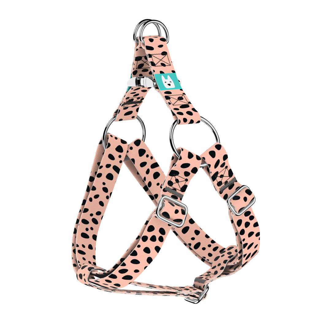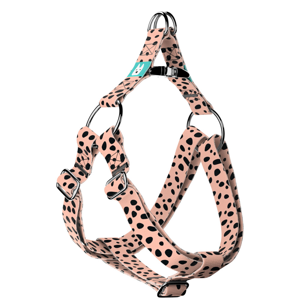 Fekete foltok rózsaszín alapon mintás belépős hám kutyáknak. – Több méretben elérhető