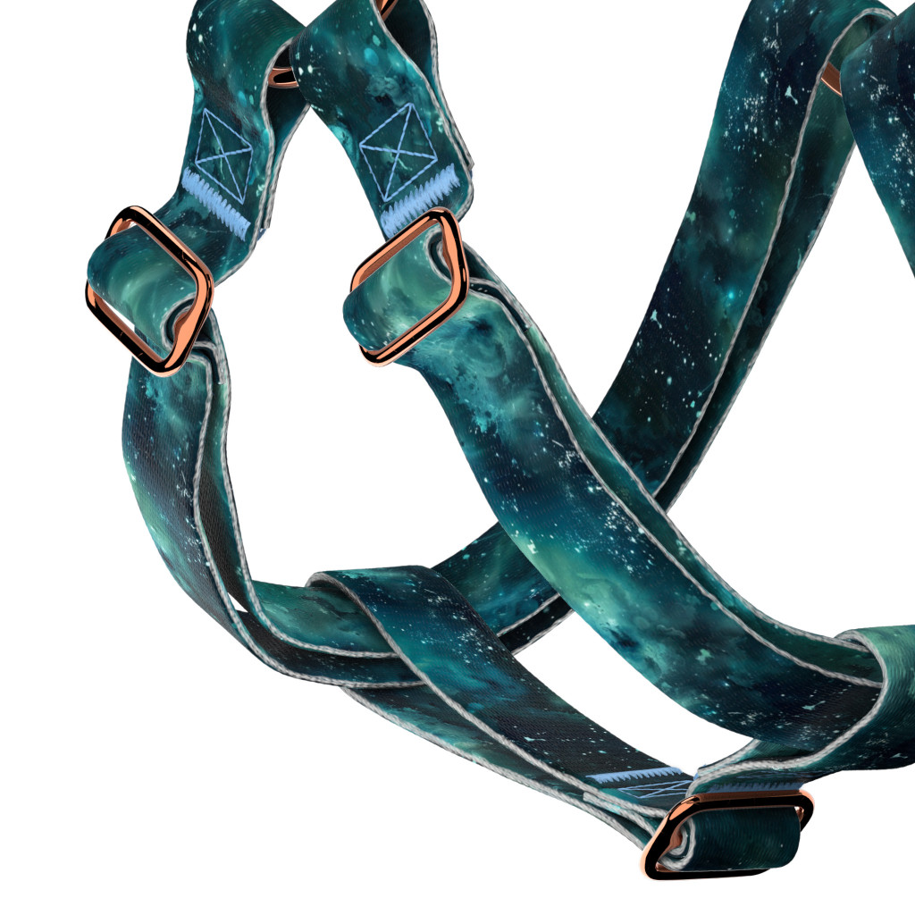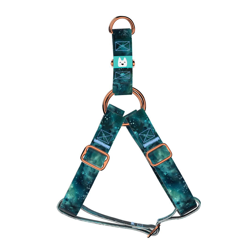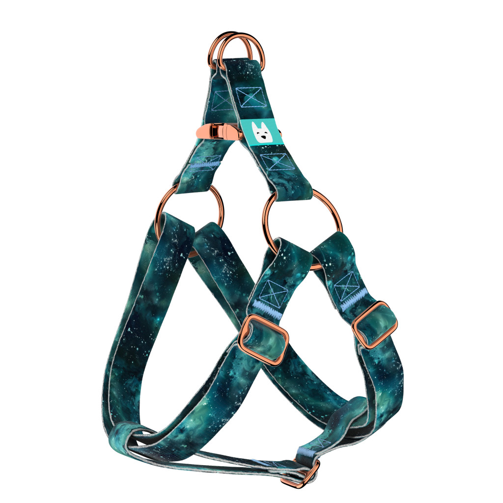 Zöld galaxis mintás belépős hám kutyáknak. – Több méretben elérhető