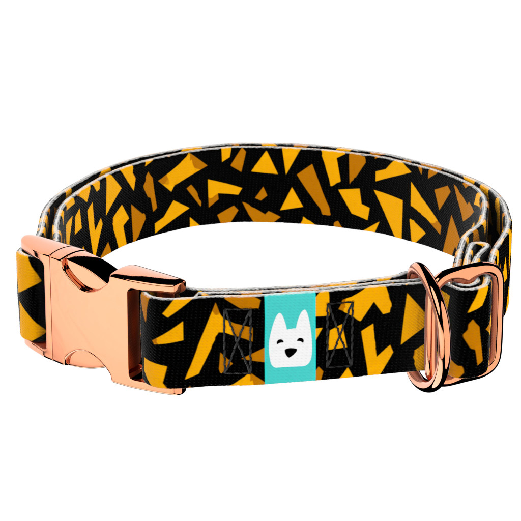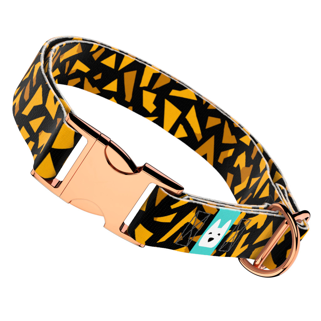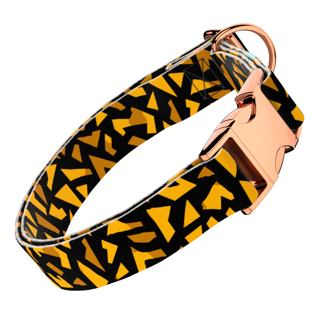 Sárga és fekete mintás csatos nyakörv kutyádnak különböző méretekben.
