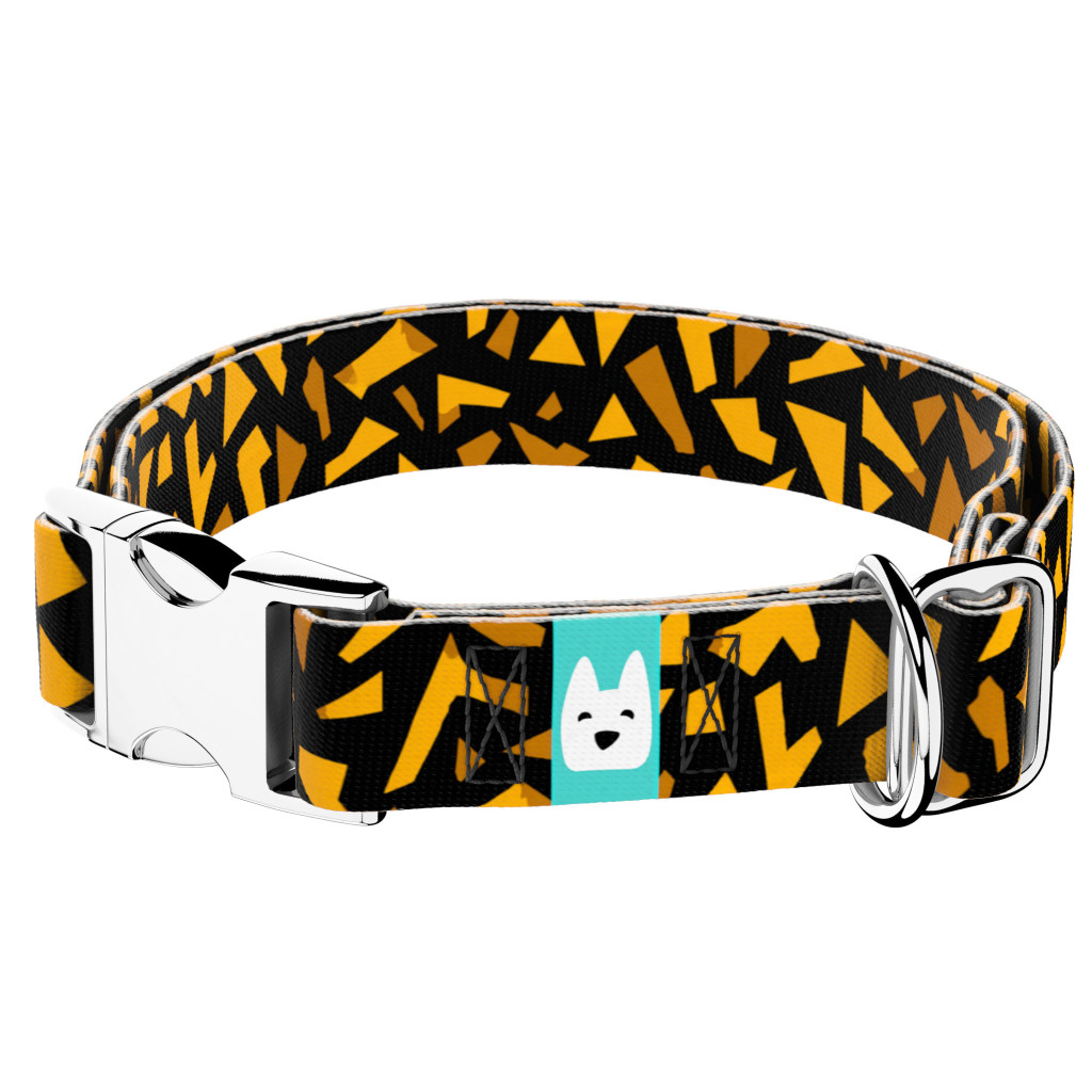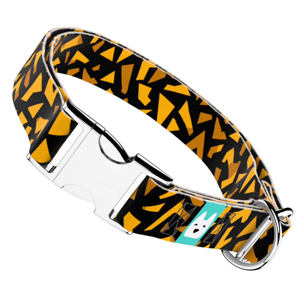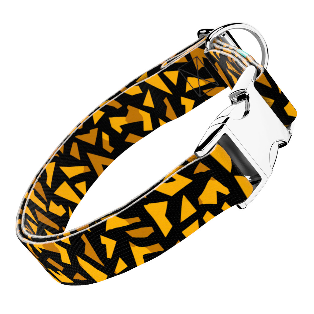 Sárga és fekete mintás csatos nyakörv kutyádnak különböző méretekben.